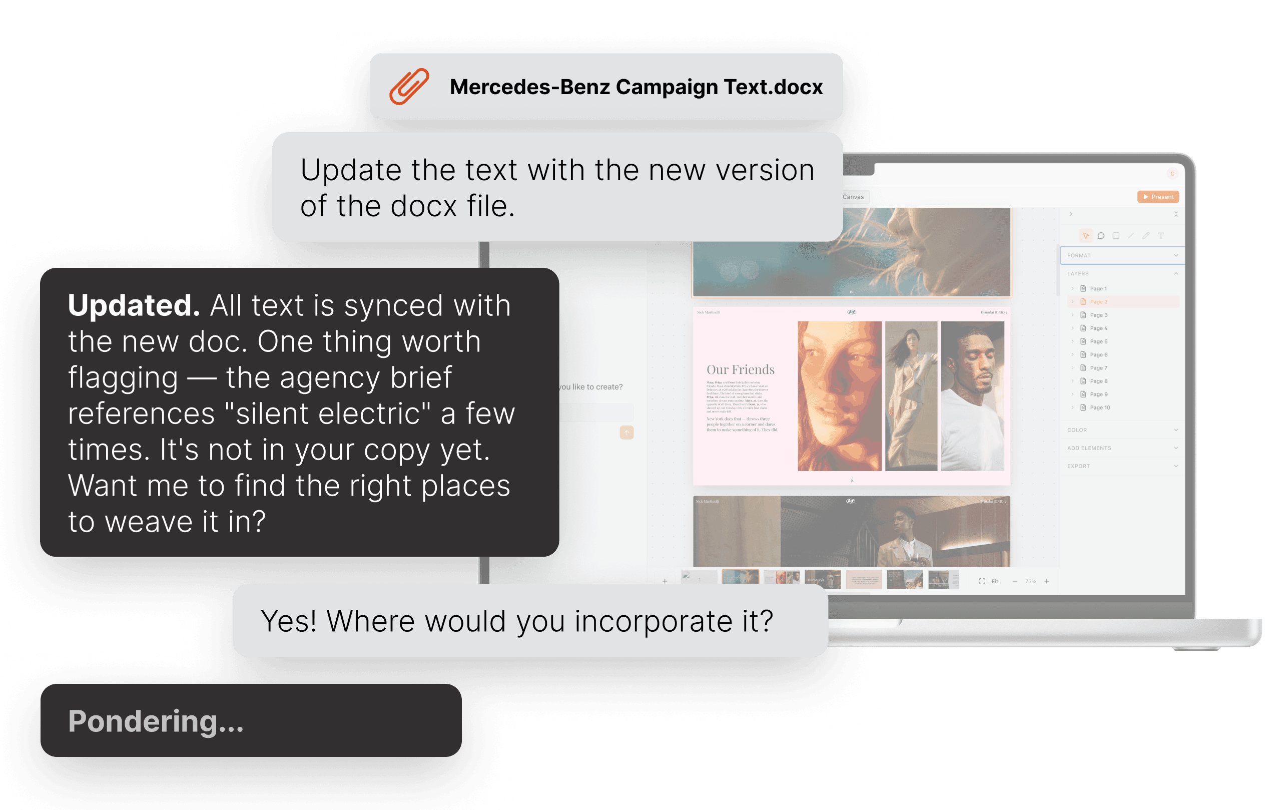 First version in seconds, not hours: Drop in your text, Cosi shapes the layout. Adjust every detail, anytime.
